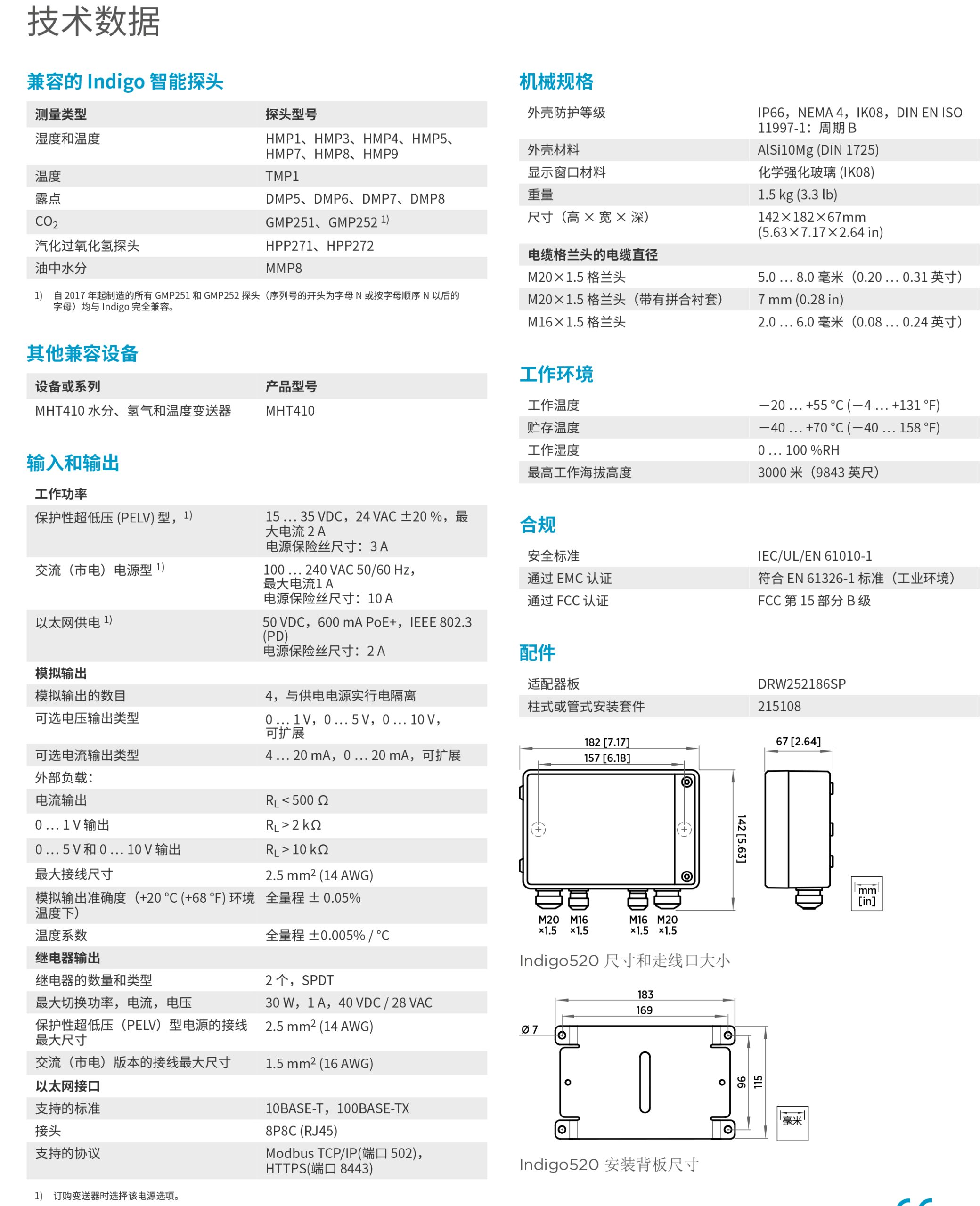 附带双探头和多参数支持的维萨拉Indigo520变送器是用于与维萨拉Indigo兼容的、独立智能探头的主机设备。该变送器为Indigo探头提供多种附加功能。触摸显示屏提供本地数据的可视化,方便配置探头。与使用独立的智能探头相比,该变送器还提供更多的连接方式、供电电压和接线方式的选择。在适合进行墙壁安装式探头安装时,它还提供机械支撑。其坚固的IP66和NEMA4等级的金属外壳确保在苛刻环境下也能具有可靠的性能。Indigo520与HMP1、HMP3、HMP9、HMP7或TMP1探头配合使用,可用于测量气压、湿度和温度。